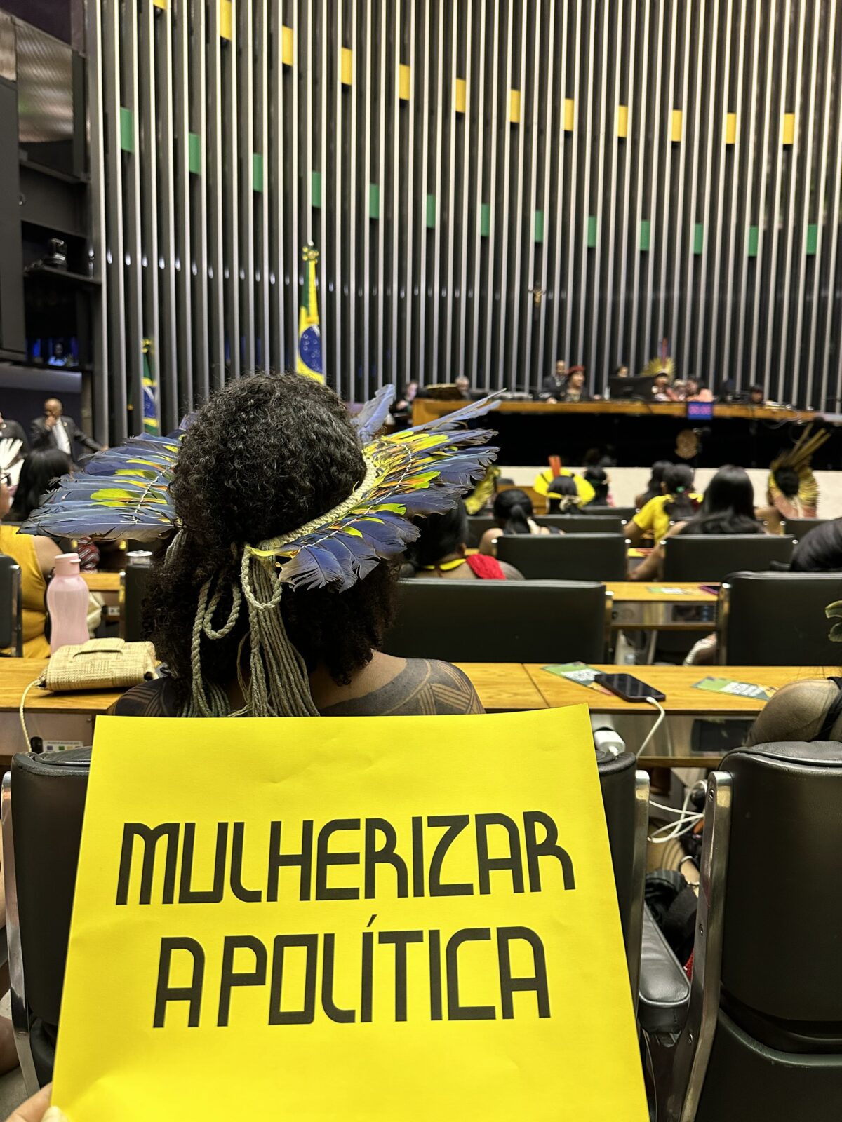 On the eve of the Indigenous Women’s March, Celia Xakriaba held a special session in the Chamber of Deputies. The Chamber, where she is the only Indigenous woman consistently speaking for Indigenous lives, rights, and territories, was filled with 500 women in headdresses. It was a vision for the future. There, she said: