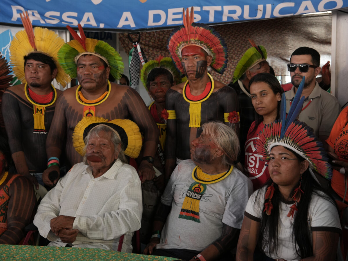 After the fluvial act, Indigenous leaders held a press conference aboard the Answer Caravan vessel, featuring the remarks of Chief Raoni Metuktire, a historic figure in the Indigenous struggle in Brazil and around the world.