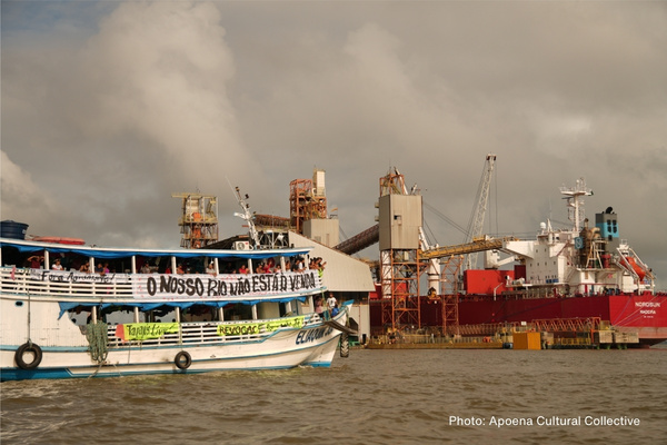 Santarém, Pará, Brazil – Today, 400 Indigenous peoples in four boats intercepted a grain barge on the Tapajós River in the city of Santarém (PA). The peaceful action aimed to draw attention from the federal government and the broader public to the impacts of transforming Amazonian rivers into export corridors. Indigenous protesters approached the vessel on the urban stretch of the river while it was docked at the multinational commodity trader Cargill’s port. The barge is part of the soy supply chain operating through the “Arco Norte” (Northern Arc) logistics corridor. Cargill’s grain terminal has been blockaded by Indigenous peoples since January 22 and today’s action expanded pressure to its riverside loading facilities.
